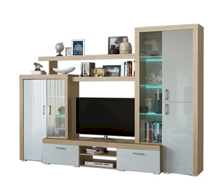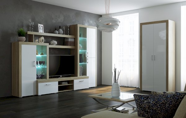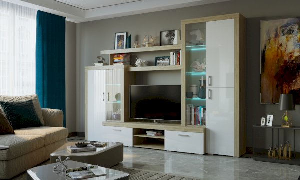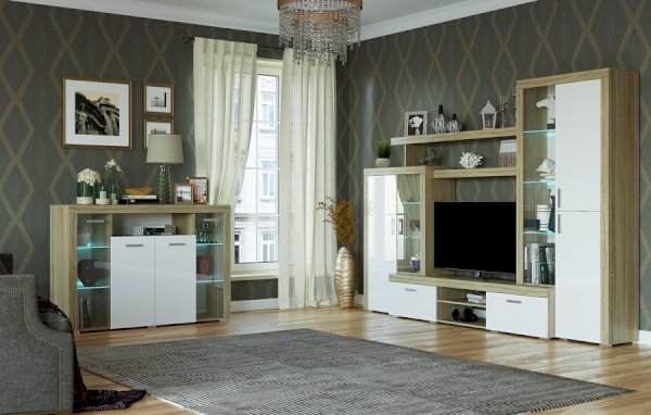Внутреннее наполнение Модульная система для гостиной Орландо - это современная и функциональная мебель для зала, с возможностью «зеркальной» сборки.