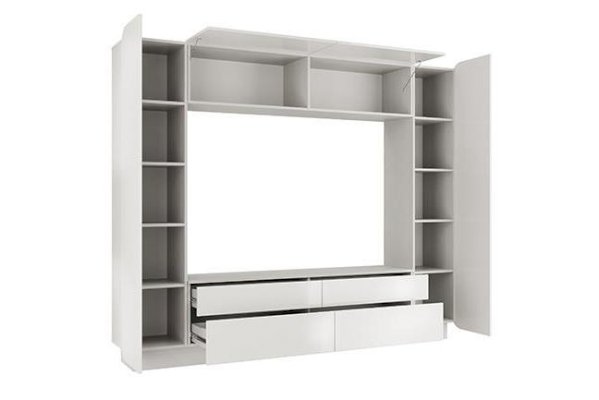 Шкаф многоцелевого назначения для гостиной выполнен в минималистичном стиле.  Строгая геометрия в формах, отсутствие лицевой фурнитуры и монохромная гамма обеспечивают визуальную лёгкость модели и интерьеру в целом.