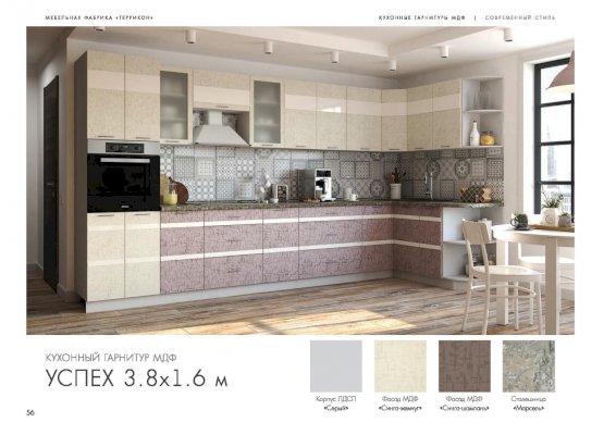 Кухня Успех изговаливается также в цветах серый/гобелен платина; серый/гобелен шампань; серый/синга жемчуг; серый/синга пурпур. Модули в этих цветовых решениях вы сможете найти в нашем интернет-магазине.