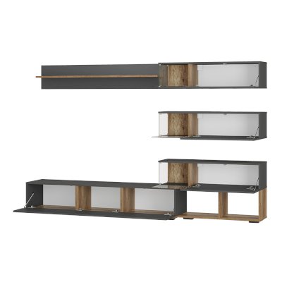 Гостиная "Рига" - это сочетание четких геометрических линий и трендовых оттенков. Строгий дизайн гостиной дополняет нестандартная деталь - полки "аквариумы" из прозрачного стекла, в них можно выставить красивые элементы интерьера или небольшие светильники для дополнительного уюта в вашем доме.