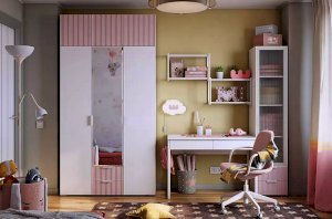 Комплектация: Полка 2 шт., трехдверный шкаф, однодверный шкаф, трехдверная антресоль, стол