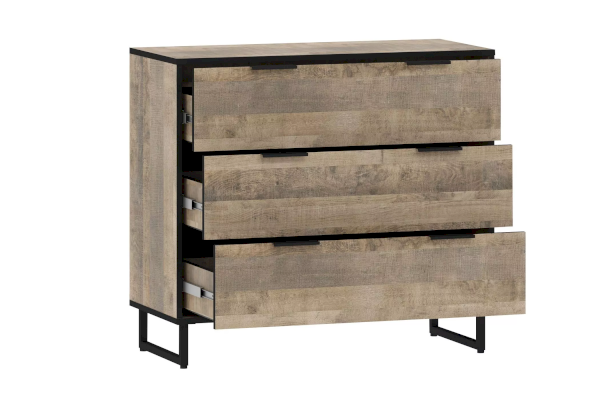 Комод представлен в двух цветах – Дуб гранж песочный и Дуб Самдал. Он оснащен тремя выдвижными ящиками со встроенными перегородками, которые открываются плавно и бесшумно за счет шариковых направляющих, а высокие опоры обеспечивают быстрый и комфортный доступ при уборке. Дополните комод шкафом или стеллажом из одноименной коллекции, чтобы оптимизировать место хранения и создать особо гармоничную атмосферу.