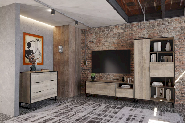 Комод из коллекции ФОЛК легко впишется в интерьер гостиной в стиле Лофт, придав ей современный и монументальный вид. Черные лаконичные ручки подчеркивают оригинальный дизайн мебели, а черная кромка эффектно выделяет фасад изделия.