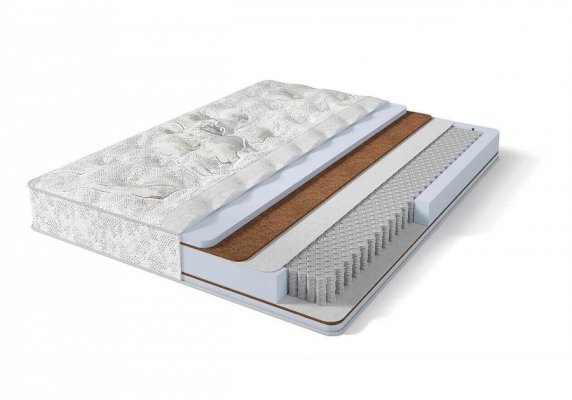 Матрас на основе блока независимых пружин. Cнимает нагрузку с позвоночника и качественно поддерживает область поясницы. Кокосовая койра обеспечивает жесткость, а современный гипоаллергенный материал Foam придает комфорт.