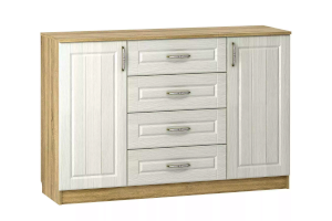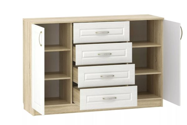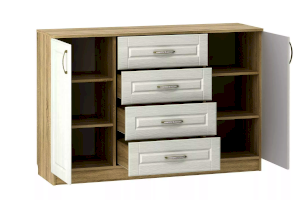 В дизайне тумбы Оливия НМ 040.35 X прослеживается четкая симметрия, которая придает внешнему виду модуля цельность. Тумба центральной части оснащена четырьмя выдвижными ящиками для хранения документов, аксессуаров и мелочей. Справа и слева от ящиков находятся две одинаковые секции с полками для одежды. Полки в сочетании с выдвижными ящиками позволят хранить в тумбе максимум вещей.