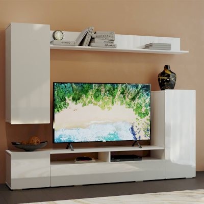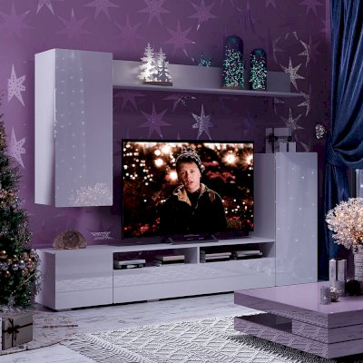 Стильный вариант гостиной Диаманд будет прекрасно смотреться в любом интерьере. Фасады без ручек и лишнего декора выглядят современно. На верхней открытой полке вы сможете разместить свои любимые сувениры или фотографии.