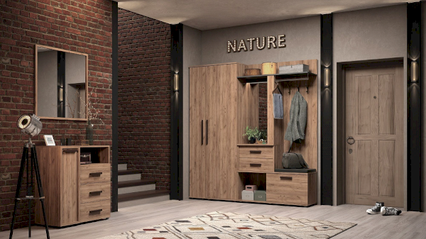Какой бы не была Ваша прихожая, с мебелью из коллекции Nature Вы сможете обустроить ее рационально и с наименьшими затратами. Современный стиль, материал под натуральное дерево, грубые детали добавят стиля входной зоне Вашей квартиры.