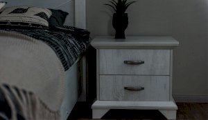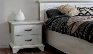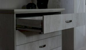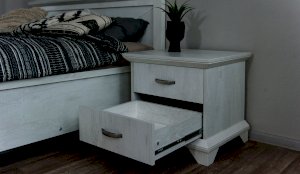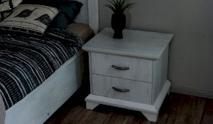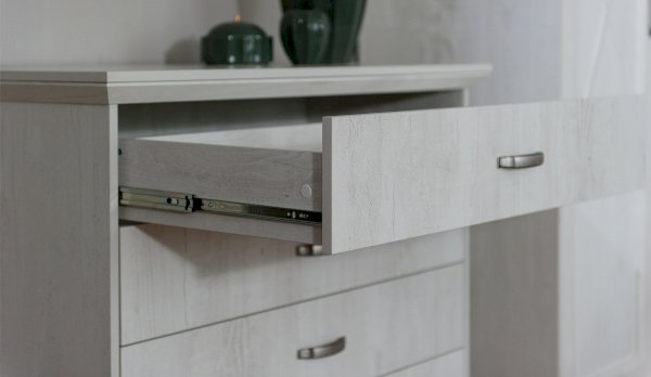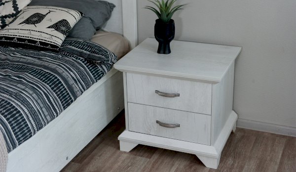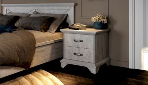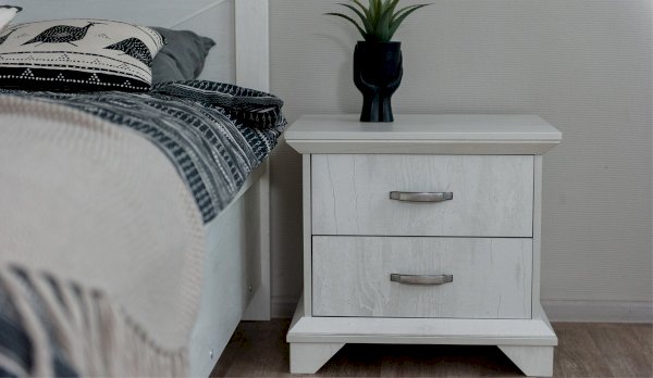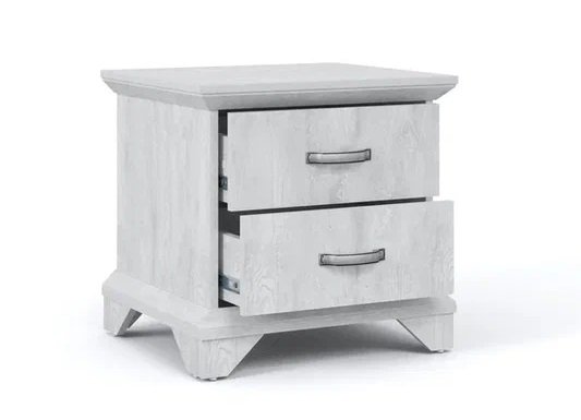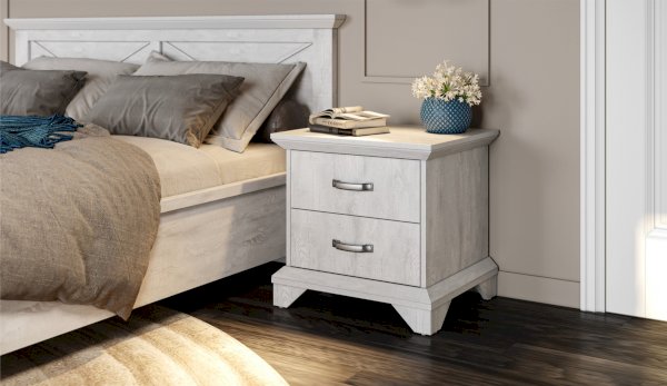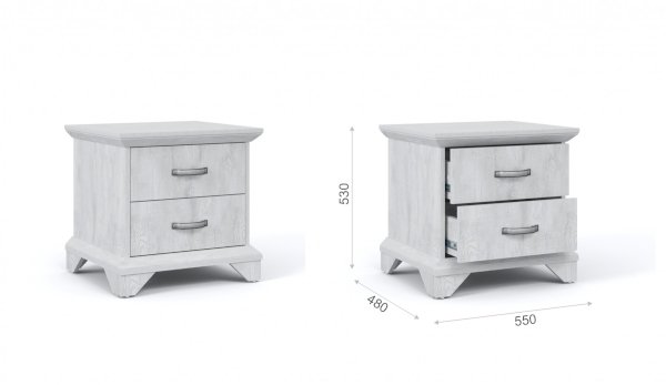 Тумба с фасадами цвета «Бетон пайн» с фактурой и рисунком натурального дерева добавят помещению света и сделают ее воздушней. Металлические ручки цвета состаренного серебра придают изысканность, а фигурные ножки и декоративный профиль крышки подчеркивают стилистику коллекции. Ящики на телескопических направляющих поместят в себя все необходимые предметы, которые важно иметь под рукой - телефон, очки, светильник или любимая книга. Мебель выполнена из экологичных материалов.