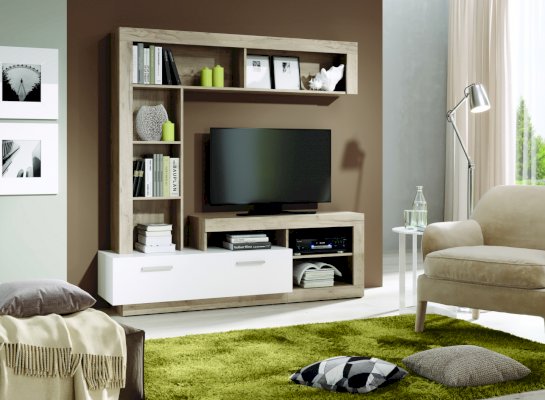 Открытая часть со стеллажом крепится к стене при помощи регулируемых навесов Scarpi. Обратите внимание! Изделие собирается только так, как изображено на фотографиях. Практичное решение по лучшей цене — это гостиная Омаха