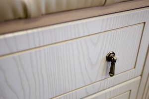 МДФ фасады декорированы патиной, нанесенной вручную, зеркало с пескоструйным рисунком, мягкое сидение и панно под вешалку декорированы каретной стяжкой высококачественной экокожей,  бронзовая фурнитура "под старину".
