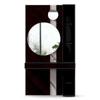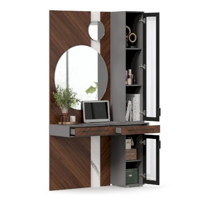 • Модуль скомбинирован из наборной панели с зеркалами, шкафа одностворчатого и стола с выдвижными ящиками