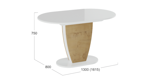 Столешница изготовлена из ЛДСП 16 мм и осветленного закаленного глянцевого стекла 4 мм, вставка выполнена из ЛДСП 22 мм. Модель имеет оригинальную скругленную форму опоры с белыми глянцевыми элементами из МДФ 4 мм по бокам. Плавные линии и креативное решение со вставками добавят кухне ноток оригинальности и эксцентричности. Основание изготовлено из МДФ 22 мм.