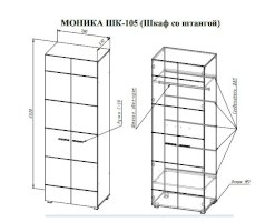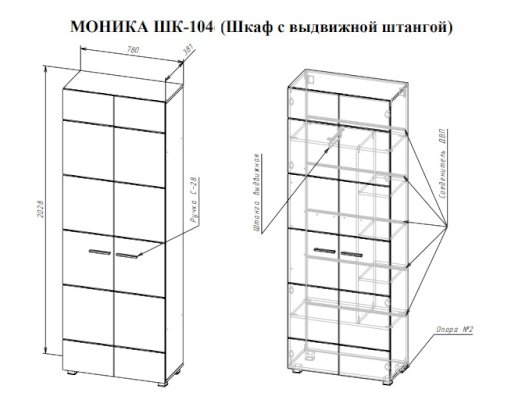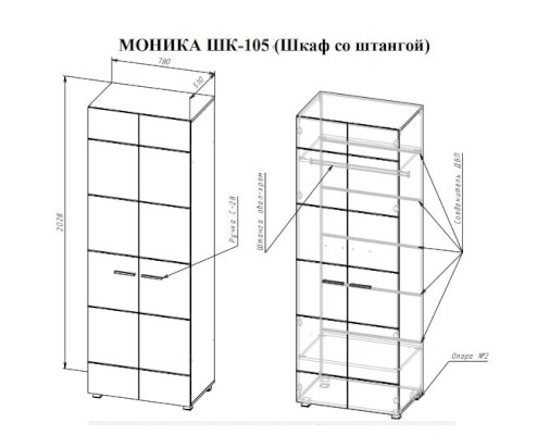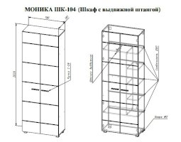 Шкаф с выдвижной штангой двустворчатый, состоит из отсека с выдвижной штангой под одежду (длинна штанги 350 мм), расположенного между двух полок, сверху и снизу, за счёт которых шкаф получает 2 дополнительных отсека для хранения.