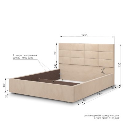Высокое изголовье деркорировано разделителями на прямоугольники - 12 шт. разного размера в зависимости от ширины кровати.