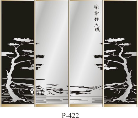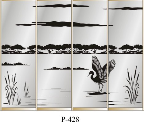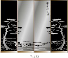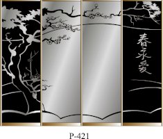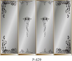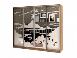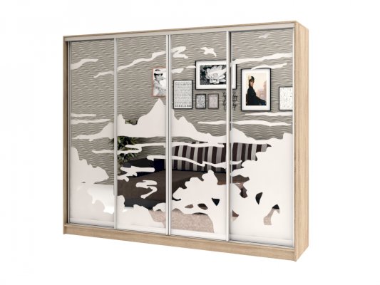 корпус - Дуб Сонома, фасады - зеркало с пескоструйным рисунком, рамка двери и треки - Серебро матовое.