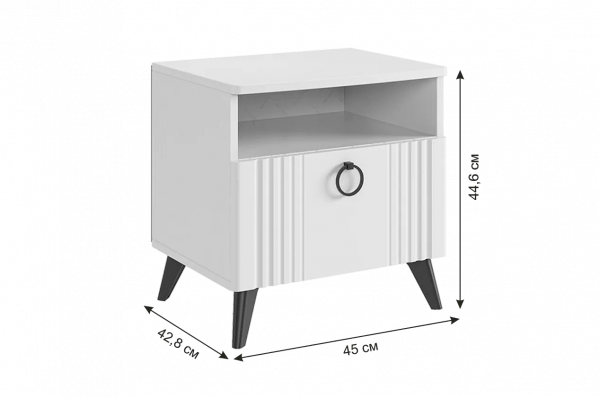 Откройте для себя прикроватную тумбу "Ева" - элегантность и функциональность в одном. Размеры 450х428х446 мм, корпус из ЛДСП белого дерева, фасады из МДФ с матовым покрытием ПВХ. Вертикальные фрезерованные полосы и трендовая металлическая ручка-кнопка добавляют изысканности. Система бесшумного закрывания, один ящик и ниша для хранения обеспечивают комфорт и удобство. Шариковые направляющие и черные пластиковые опоры высотой 120 мм подчеркивают стиль и современность. Прикроватная тумба "Ева" – идеальное сочетание качества, стиля и функциональности для вашей спальни.