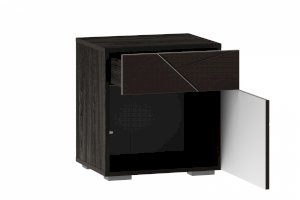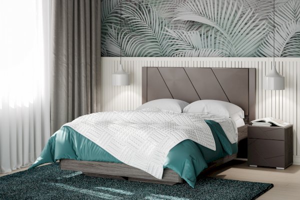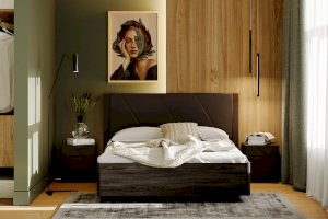 Все ручки в мебели — скрытые. Элементы изголовья кровати обтянуты мягким кожзамом, а оригинальное основание с эффектом «парения» преображает интерьер. В выдвижных ящиках используется система скрытых направляющих Quadro stop control, что позволяет легко и почти бесшумно использовать ящики. Большие зеркала шкафа визуально расширяют пространство комнаты и сделают утренние и вечерние ритуалы еще приятнее.