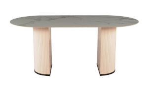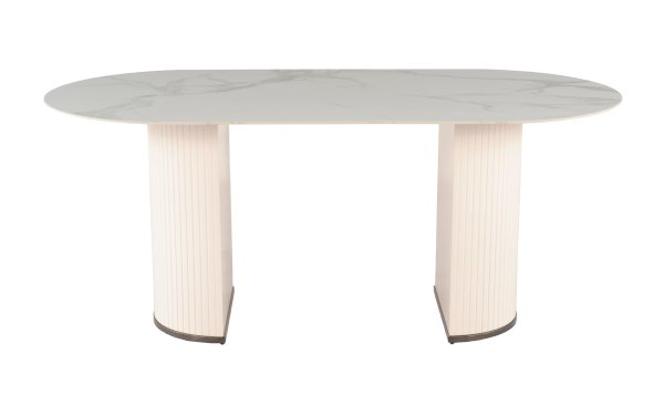 Столешница из керамики отличный вариант для кухни. Материал знаменит прочностью и долговечностью, поверхность устойчива к различным внешним воздействиям. Поверхность столешницы с рисунком белого мрамора гармонично сочетается с массивными ножками бежевого цвета. Простая овальная форма стола позволит легко вписать его в современный интерьер, стол украсит кухню, гостиную или современное кафе, ресторан. Опорные плиссированные ножки в лаконичном дизайне надёжно удерживают всю конструкцию и дополняют монолитный образ.