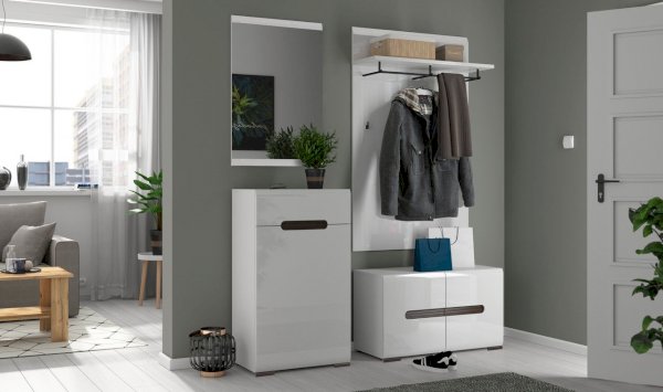 Вешалка представляет собой вертикальный щит, на который крепятся полка, металлическая составная вешалка и металлические крючки. На верхней части вешалки крепится планка декоративная из МДФ в цвете "Белый блеск". Вешалка  крепится на стену при помощи кронштейнов. Максимальная нагрузка на вешалку до 5 кг На полке вы сможете разместить головные уборы, шарфы и т.д.