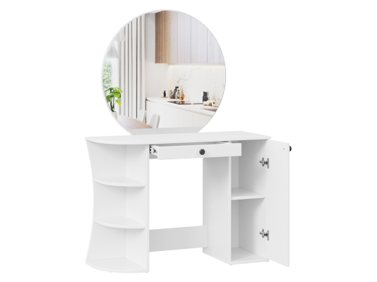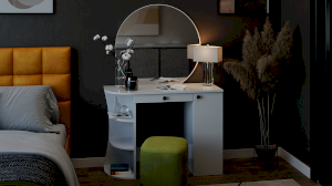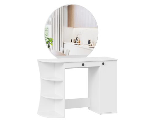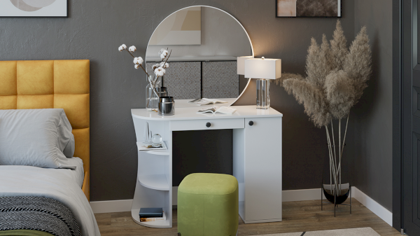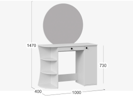 Помимо внешней привлекательности стол имеет большое круглое зеркало, вместительную столешницу под которой располагается как открытая ниша для хранения, так и с дверцей, где можно разместить все необходимые аксессуары и косметику. Такое количество мест для хранения позволит Вам сократить время на создание своего неповторимого образа.