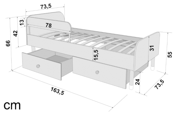 Комплект кровати состоит из каркаса кровати и ортопедического основания. Бортик, ящики, матрас и постельные принадлежности приобретаются отдельно.
