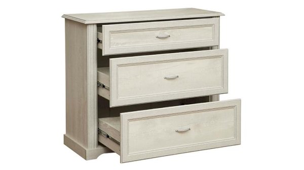 Классический комод с тремя выдвижными ящиками. Место локации – спальня, гостиная, холл. Верхний ящик хорошо подойдет для нижнего белья (если комод расположен в спальне), для документов (если модуль стоит в гостиной), для перчаток, ключей и счетов (если предмет мебели находится в прихожей). Средний и нижний ящики больше по размеру и более вместительны. Они отлично подойдут для постельного белья и для одежды, которую можно сложить, не боясь, что она помнется. Над комодом можно повесить зеркало – получится лаконично и функционально. Красиво, но без излишеств. Глубина в 400 мм делает изделие компактным и вместительным одновременно.