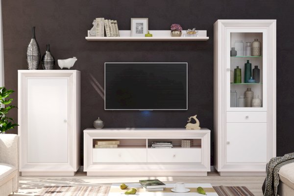 В модульной коллекции «Прато» в стиле Ар-деко вы найдёте широкий выбор ТВ-тумб, различных по габаритам и конструкции. Данная модель имеет ширину 1364 мм, благодаря чему с легкостью поместит телевизор с большой диагональю, при этом не большая глубина 426 мм позволит не загромождать пространство. К данной тумбе идеально подойдёт навесная полка с такой же шириной.