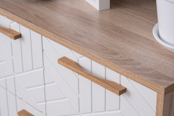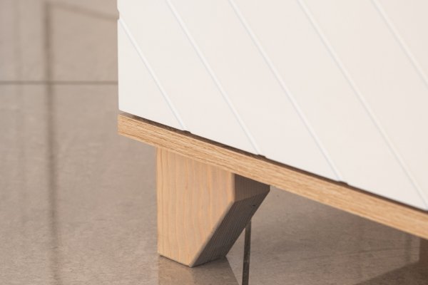 Комод оборудован деревянными ручками из массива дуба. Регулируемые опоры, выполненные из массива сосны, позволяют нивелировать неровности напольного покрытия.