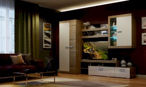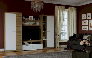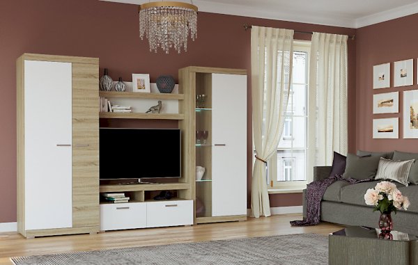 В гостиной Соната применяются современные европейские декоры: корпус выполнен из ЛДСП Дуб сонома, фасад из ЛДСП Белый глянец. Декоры отличаются выраженной тёплой древесной текстурой, а фасадная часть подчёркнута горизонтальными линиями текстуры и стильными планками МДФ, представляющими собой элементы корпуса и фасада.
