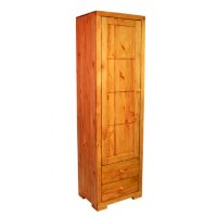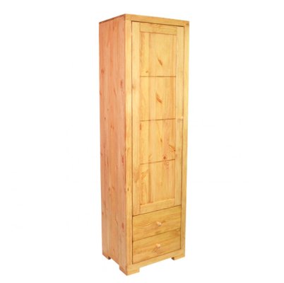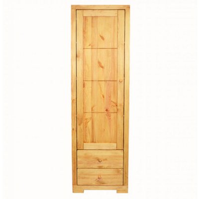Этот однодверный шкаф имеет четыре полки за дверью. В нижней части витрины расположены два ящика с плавным механизмом выдвижения. Эта простая и удобная конструкция в силу своей лаконичности будет всегда популярна и актуальна. Массив сосны, из которого изготовлена витрина, позволит мебели сохранить свои высокие эксплуатационные свойства и безупречный внешний вид на протяжении многих лет.