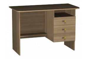 Стол выполнен в лаконичном стиле. Конструкция стола включает в себя просторную столешницу, узкую полку и тумбу с нишей и выдвижными ящиками.