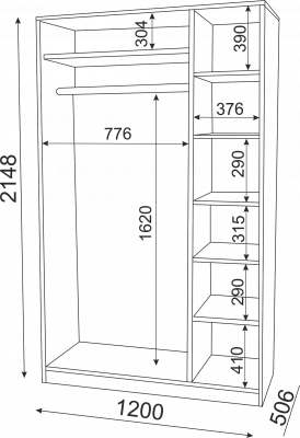 Особенности: Шкаф имеет отделение со штангой для вещей на вешалках и жесткой полкой над ним, и секцию с полками из которых: три - съемные, две - жесткого крепления (через одну).