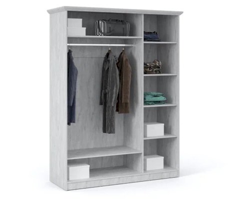 Распашной трехдверный шкаф выполнен в популярном стиле неоклассика – белые рамочные фасады с фактурой и рисунком натурального дерева, декоративные крестообразные накладки, фигурные ножки и карниз все это придает комнате элегантный и светлый вид. Вместительные отделения со штангой и полками поместит в себя верхнюю одежду, коробки с обувью и головные уборы. Мебель выполнена из экологичных материалов.
