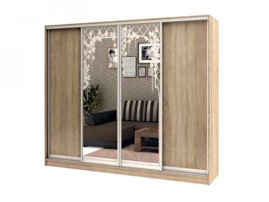 Данное изображение представлено в следующих цветах: корпус - Дуб Сонома, фасады - Дуб Сонома (2 шт.) и зеркало с пескоструйным рисунком (2 шт.), рамка двери и треки - Серебро матовое.