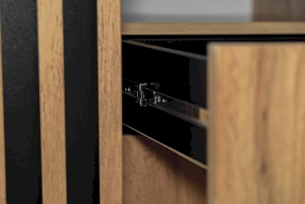 Ручки ящиков выполнены из металла, они очень маленькие, изящные и удобные. На дверном полотне цвета дерева черная ручка – удачное оттеночное решение.