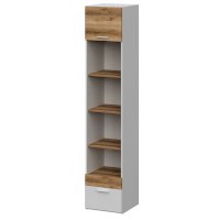 Сверху антресоль, открывается вверх на газлифте. Три открытые полки в цвете делано светлый. Внизу два ящика (один большой, второй маленький (по ширине цветной вставки, без ручки). Направляющие НПВ шариковые.
