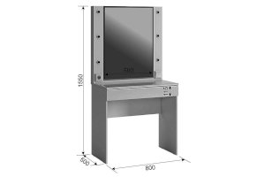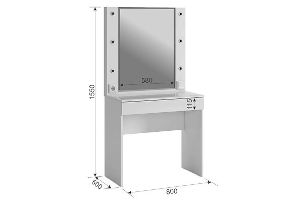 Состоит из: зеркала с подсветкой, встроенного выключателя, розетки для фена, стеклянной столешницы и выдвижного ящика.