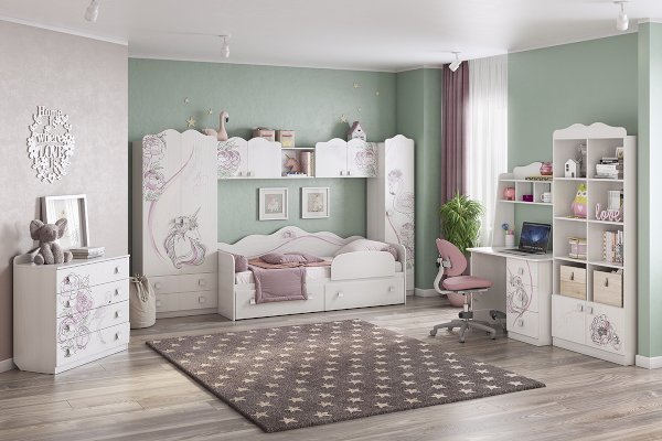 Стильный и модный шкаф детской «Фэнтези» - обрадует каждого ребенка. По Вашему желанию в шкафу можно установить штангу или еще две дополнительные полки. Необычный принтерный рисунок на фасадах выдержан в общем стилистическом решении. Рисунок устойчив к истиранию и ультрафиолету.