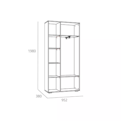 Отдел с выдвижной штангой и двумя полками предназначен для хранения одежды на вешалках-плечиках, а также коробок с обувью. В левой части модуля расположена секция с полками, содержимое которых надежно защитят от попадания грязи и пыли глухие фасады. Наличие двух створок позволит разместить сезонную и повседневную одежду в разных частях данного отдела. Во время поисков понадобится открыть только ту дверцу, за которой находится нужная в данный момент вещь, что предотвратит путаницу.