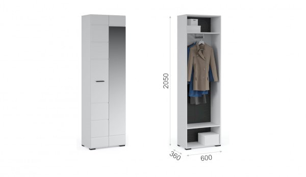 Компактный шкаф Йорк – это решение для небольшой спальни, гостиной или прихожей. Он выполнен в современном стиле – сочетает в себе функциональность и эффектный внешний вид: горизонтальная фрезеровка фасадов, контрастные черного цвета ручки и задняя стенка из ХДФ. Глянцевые белые фасады High Gloss из МДФ и зеркало в полный рост наполняют помещение светом, делают его воздушнее. Внутри предусмотрены секции для белья и отделение со штангой. Идеально компонуется со всеми модулями системы Йорк.