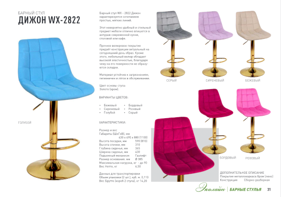 Барный стул ДИЖОН WX-2822 со спинкой непременно придется вам по вкусу и создает в кафе неповторимую атмосферу. Основа барного стула ДИЖОН WX-2822 - мощная стальная хромированная опора, которая крепится к надежному основанию в форме плоского диска и гарантирует требуемый уровень устойчивости. Сиденье стула изготовлено из экологически чистой гнутоклееной фанеры и обтянуто тканью с применением пенополиуретана различной толщины. Мягкие формы стеганого сиденья обеспечат посетителю комфорт.