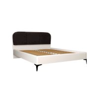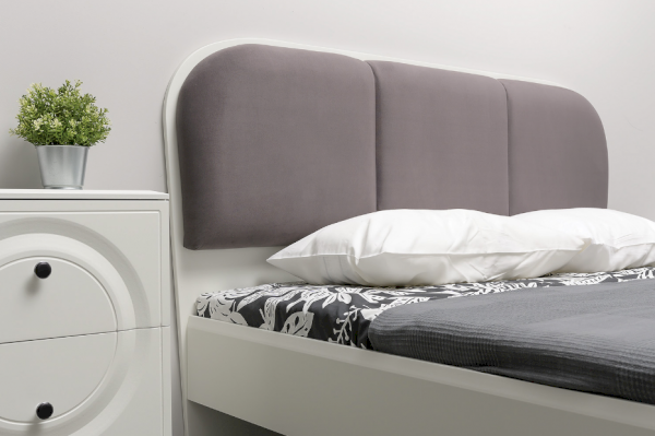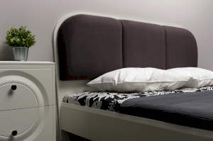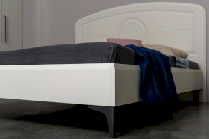 Кровать установлена на высокие ножки, что делает конструкцию лёгкой и воздушной, изголовье кровати декорировано пышным мягким элементом. Матрас укладывается на ортопедическое основание с гнутоклееными ламелями.
