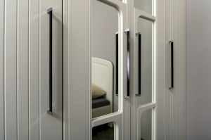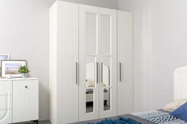 Фасады выполнены из МДФ с матовой ПВХ-плёнкой. Такое решение делает мебель визуально более "мягкой", комфортной и расслабляющей, что особенно актуально для спальни.