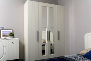 Нестандартно и интересно решён декор двустворчатого шкафа. Зеркало накладывается изнутри фасада, проявляя таким образом сквозную ажурную фрезеровку.