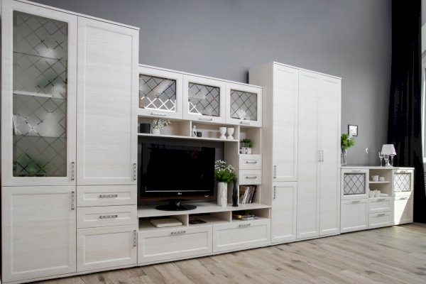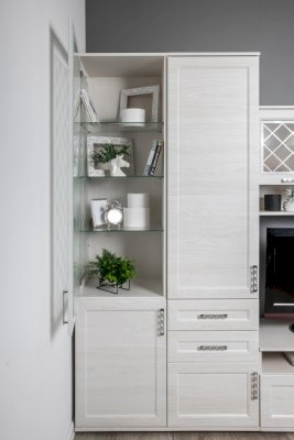 Витрина со стеклянной дверцей и боковиной, за которыми просматриваются полки и выставленные на них предметы. Стекло делает витрину визуально легкой, компактной, а всему помещению добавляет света и торжественности. Шкаф витрину можно использовать не только в сочетании с другими модулями гостиной, но и как отдельный предмет мебели.