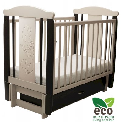 Кроватка декорирована фрезерным рисунком "Бабочка". Уникальные фрезерные рисунки размером от 50 см на обеих спинках.