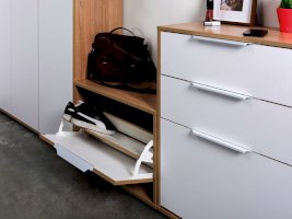 В линейке присутствуют модули с нестандартной конструкцией, которые не оставят без внимания узкие углы, повышая вместимость прихожей в разы.