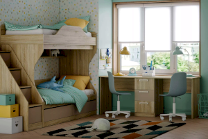 Модуль оснащен книжной полкой и вместительными бельевыми ящиками, что позволяет использовать их в качестве дополнительного места для хранения вещей. Лестница, которая входит в комплект состоящая их четырех ступеней-ящиков дает дополнительное место для хранения для игрушек и детских вещей. Ограничитель без острых углов на верхнем ярусе, обеспечит ребенку безопасный сон.