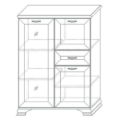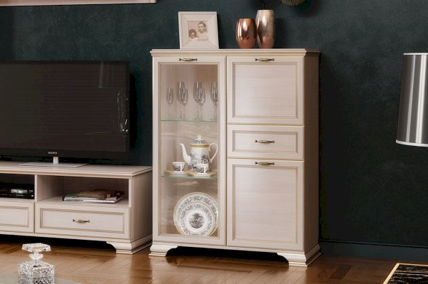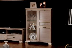 Стеклодверь дает возможность любоваться красотой наполнения шкафа, а система ящиков и отделений с дверками поможет хранить в закрытом любые предметы.
