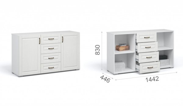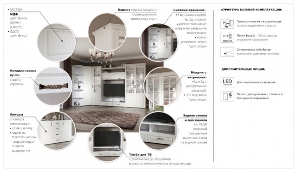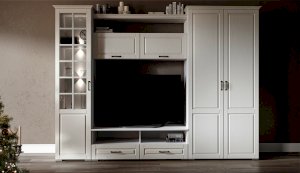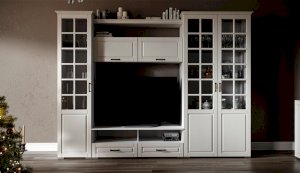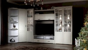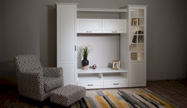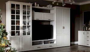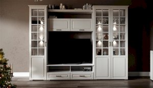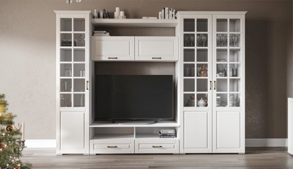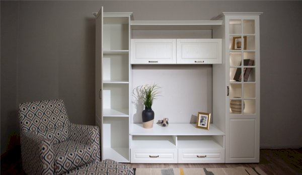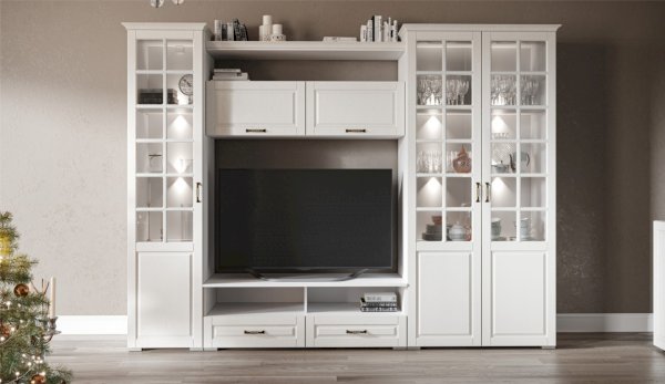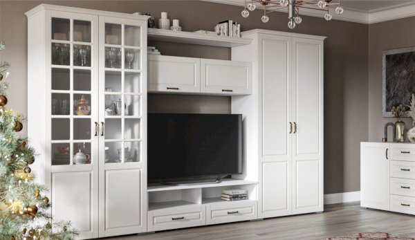Функциональная стенка Лацио создана для тех, кто ценит комфорт, уют и эргономику. Сочетание белоснежного цвета и стеклянных фасадов визуально расширяет пространство, добавляет света и лёгкости. Декоративными элементами стенки служат фрезерованные фасады из МДФ с текстурой дерева и фигурный карниз. В шкафу с прозрачными витринами будет идеально смотреться красивая посуда. Тумба для ТВ с открытыми и закрытыми полками разместит приставки, медиа устройства. Система Лацио состоит из множества отдельных модулей, благодаря чему можно легко подобрать мебель для комнаты любого размера и нужного вам функционала.